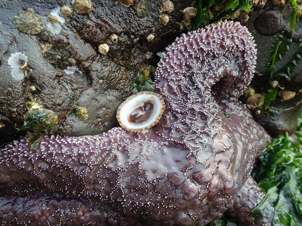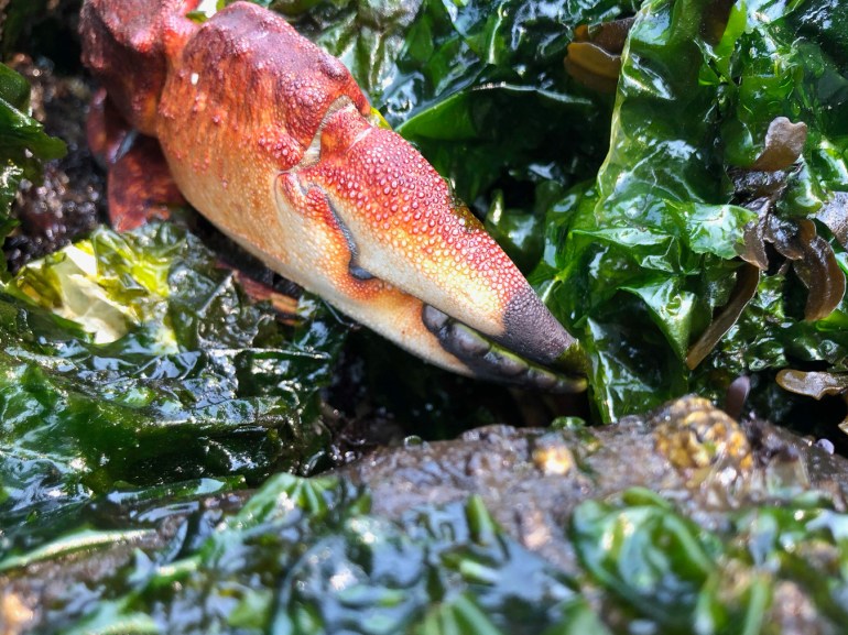 Empty limpet shell, Lottia, resting in the crook between Pisaster rays | Orcas Island, WAMorning sunlight on Chondracanthus | Orcas Island, WAI’ll share the wrack line with a great blue heron any day | Orcas Island, WAHelmet crab, Telmessus cheiragonus, met its match | Orcas Island, WA***