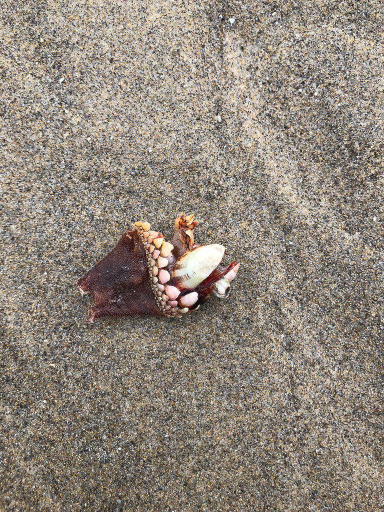 AnticipationSea oats, Nucella eggs, Emerita fragment (lower right)Couple conifersThree ecosystems represented: forest (Sitka spruce), estuary (eelgrass), open ocean (pyrosome)Meant to be firewood; what now?Probably Corbicula fluminea, a freshwater or brackish clam | a drifted shell from a nearby river?Fat gaper, Tresus capaxRazor clam, Siliqua patulaThe swash rushes outDungeness, Metacarcinus magisterDrifted bamboo DrifterDelicate blades of a red epiphyte on a bull kelp stipe | Perhaps Pyropia nereocystis?Your guess is as good as mine***